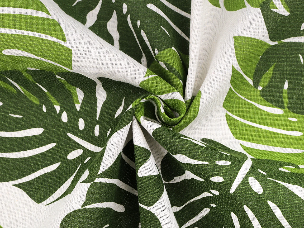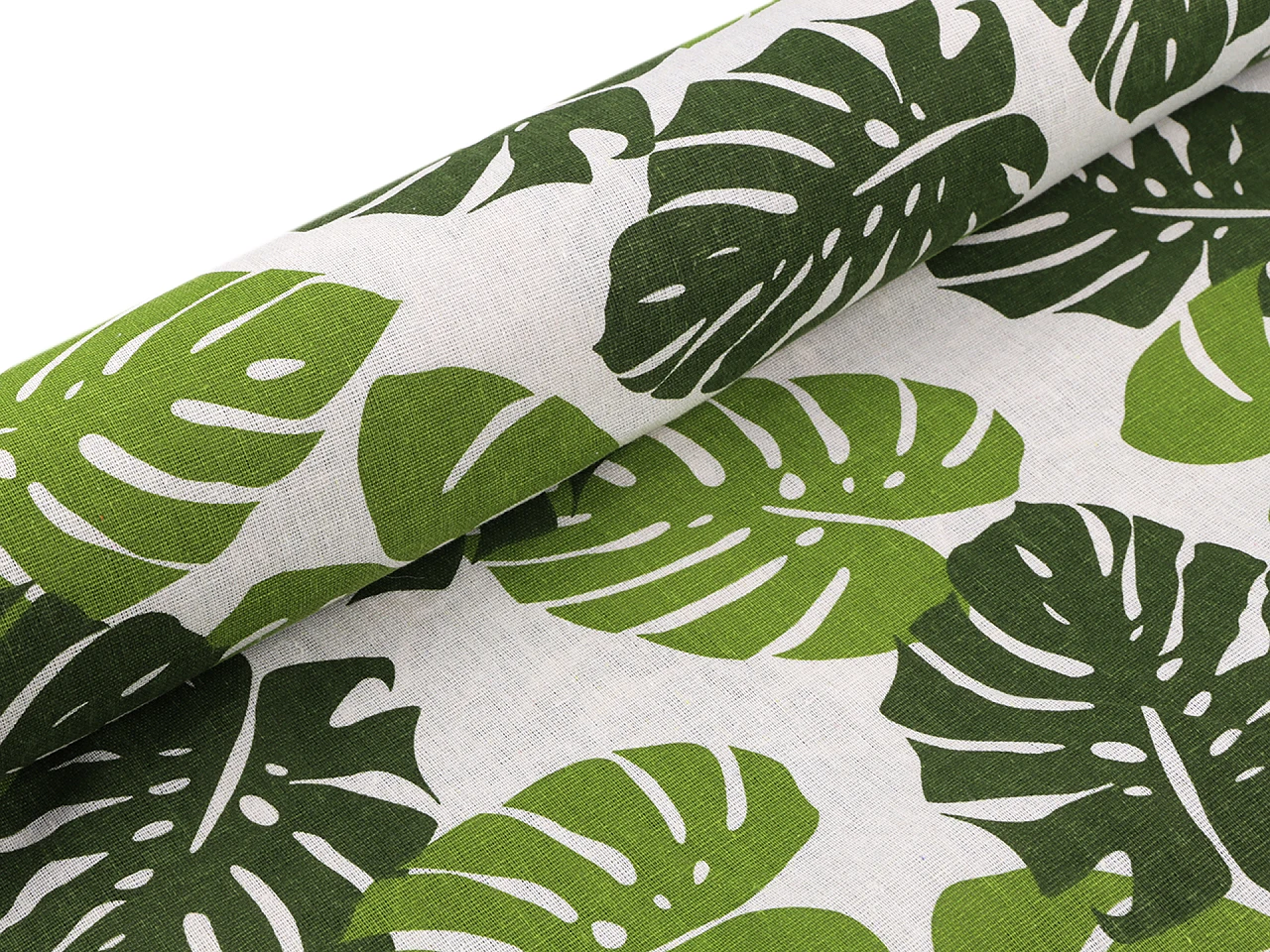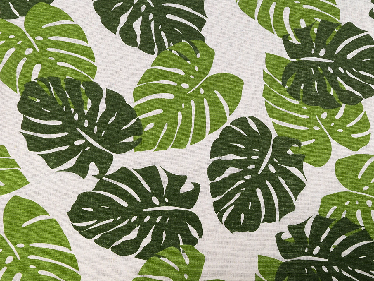 Doskonałej jakości tkanina bawełniana dekoracyjna typu "home decor" imitująca len: zielone liście monstery na białym tle. Wyrazisty wzór. Mocna, trwała, mało gniotąca się, bardzo naturalnie wyglądająca.