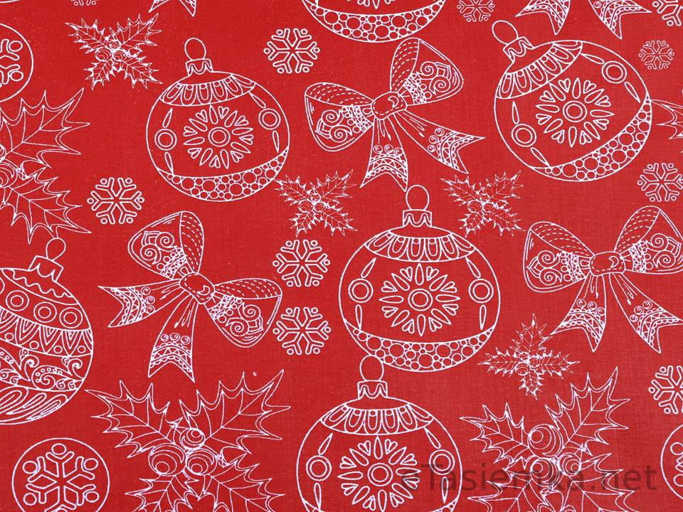 Wysokiej jakości bawełna we wzór białych bombek i kokardek na czerwonym tle.