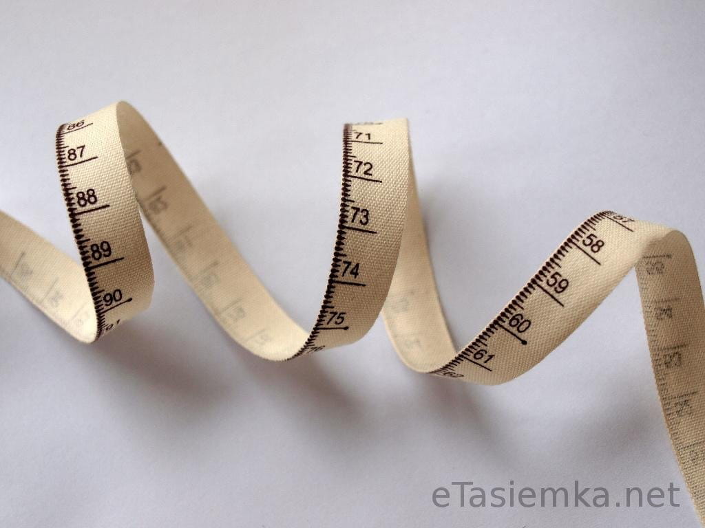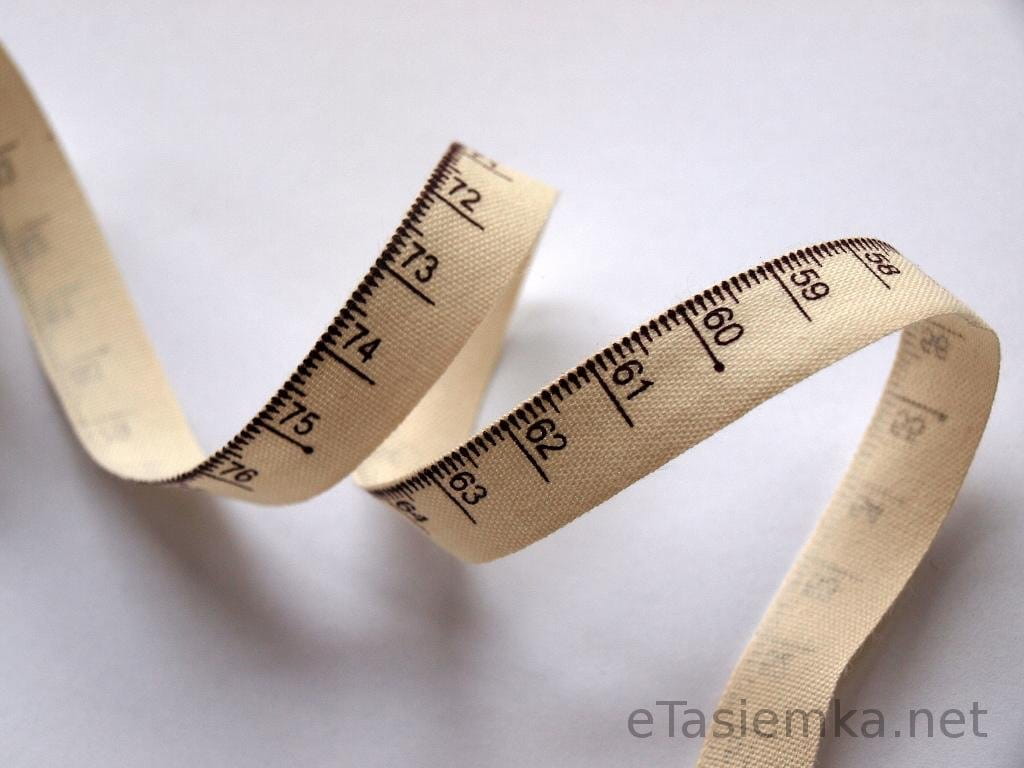 Efektowna tasiemka bawełniana we wzór miarki krawieckiej. Brązowy wzór na kremowym tle. Oszczędna w formie i nietypowa.